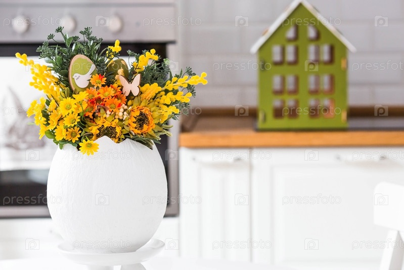 Весенний букет в яйце, пасхальные кролики и яйца с золотым узором на столе. На заднем плане — белая кухня в скандинавском стиле. Красивая поздравительная открытка. Пасхальный декор в доме