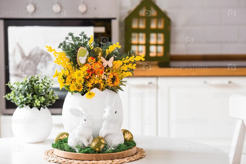 Весенний букет в яйце, пасхальные кролики и яйца с золотым узором на столе. На заднем плане — белая кухня в скандинавском стиле. Красивая поздравительная открытка. Пасхальный декор в доме
