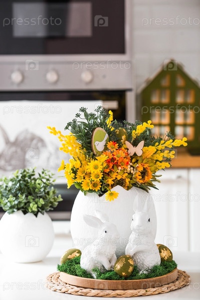 Весенний букет в яйце, пасхальные кролики и яйца с золотым узором на столе. На заднем плане — белая кухня в скандинавском стиле. Красивая поздравительная открытка. Пасхальный декор в доме