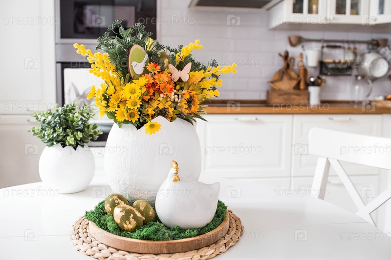 Весенний букет в яйце, на столе пасхальная курочка и яйца с золотым узором. На заднем плане — белая кухня в скандинавском стиле. Красивая поздравительная открытка. Пасхальный декор в доме