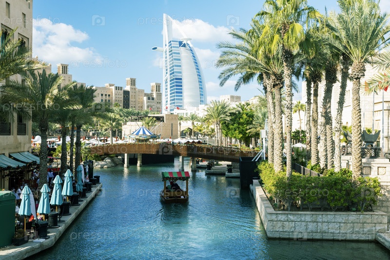 Прекрасный вид на Мадинат Джумейра или «Дубайскую Венецию» в летний день. Известная туристическая достопримечательность ОАЭ