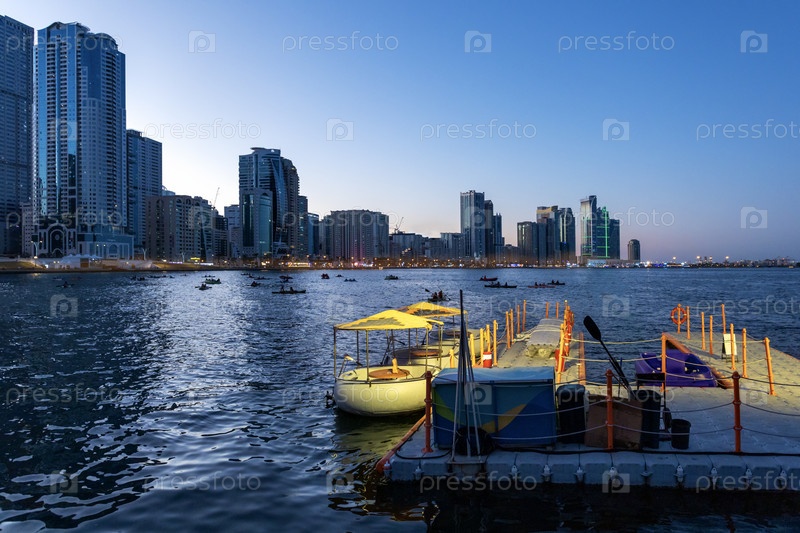 Прекрасный вид на город Шарджа с морем, лодки в сумерках. Объединенные Арабские Эмираты