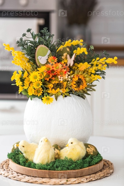 Весенний букет, желтые цыплята в большом яйце и пасхальные яйца с золотым узором на столе. На заднем плане — белая кухня в скандинавском стиле. Пасхальный декор в доме