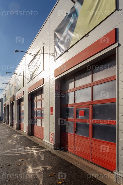 Здание с мастерской по ремонту коммерческого транспорта с шестью гаражными воротами. Современный гараж с автоматическими воротами для грузовых и больших автомобилей. Внешний вид