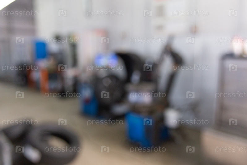 Размытое изображение внутри шиномонтажного центра. Замена резины на колесах автомобиля. Балансировка колес. Центр обслуживания автомобильных шин авторемонтная мастерская размытый фон