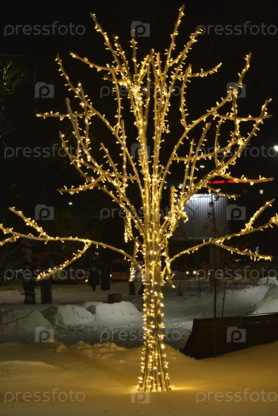 Светлая праздничная иллюминация в новогоднем городе. Искусственные деревья с желтыми огнями. Рождественская гирлянда