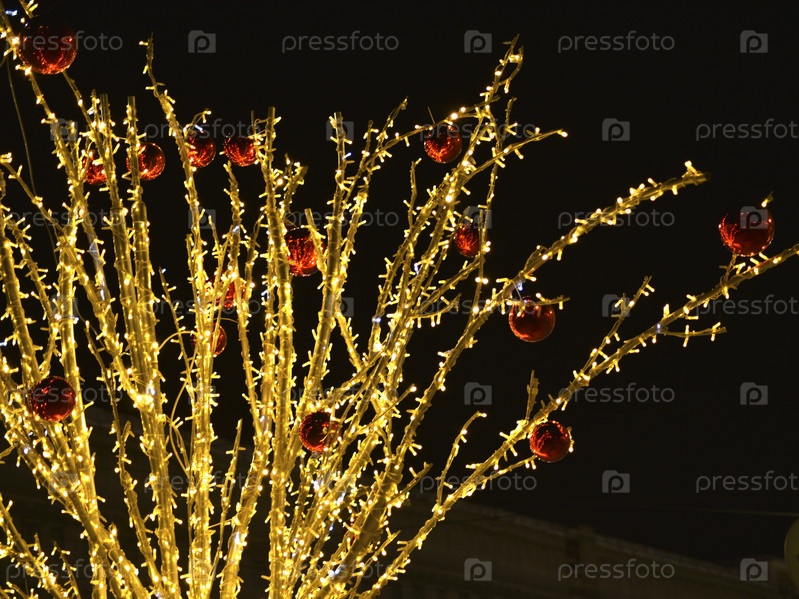 Светлая праздничная иллюминация в новогоднем городе. Искусственные деревья с желтыми огнями. Рождественская гирлянда
