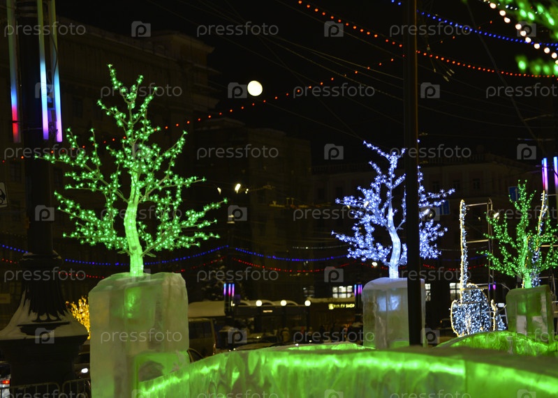 Яркая праздничная иллюминация в городе в Новый год. Искусственные деревья с зелеными светодиодами. Рождественские огни