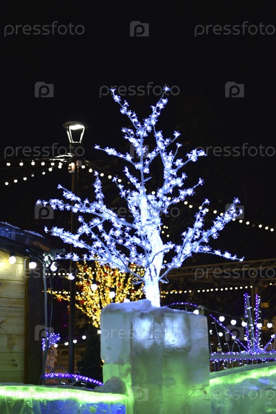 Яркая праздничная иллюминация в городе в Новый год. Искусственные деревья с зелеными светодиодами. Рождественские огни