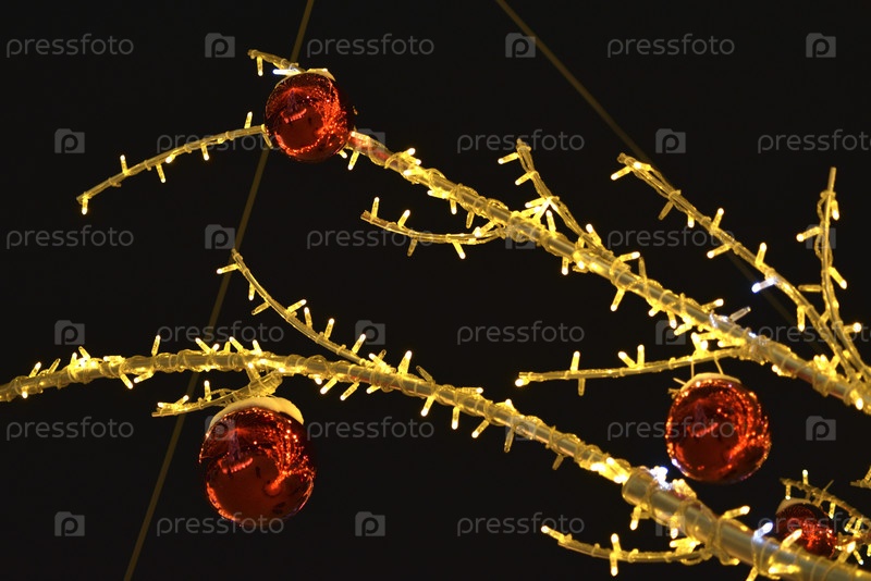 Светлая праздничная иллюминация в новогоднем городе. Искусственные деревья с желтыми огнями. Рождественская гирлянда