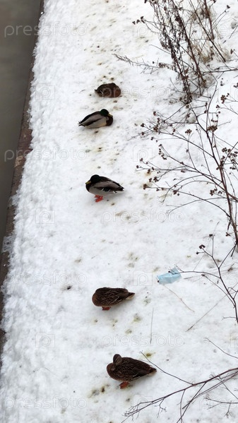 Дикие утки сидят на снегу