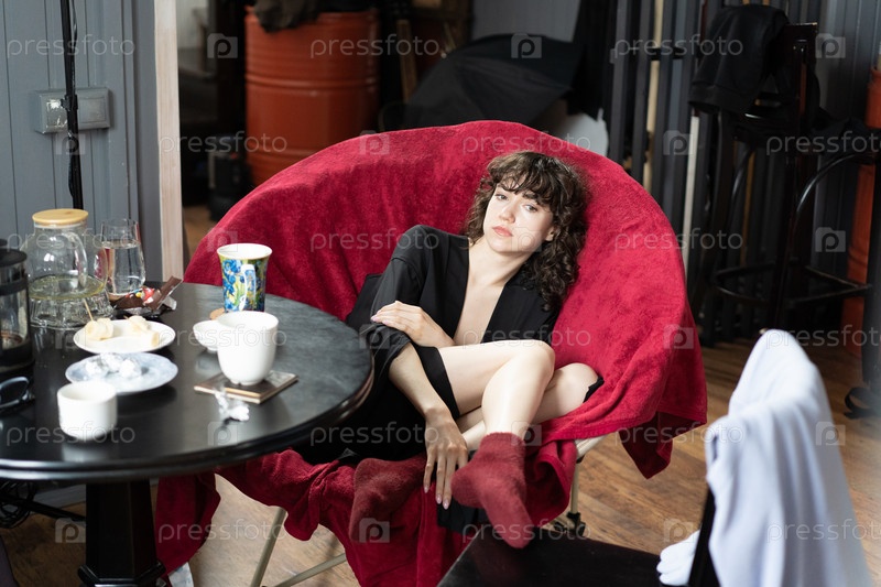 Молодая красивая женщина сидит в красном кресле в студии