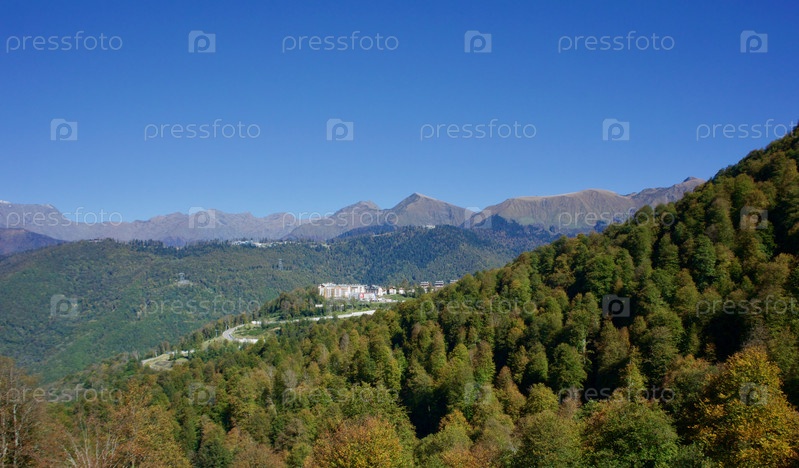 Вид на спортивный гостиничный комплекс Роза Плато на фоне Кавказских гор. Сочи Россия