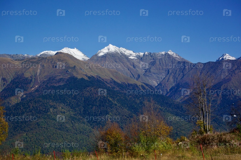 Вершины Кавказских гор, покрытые снегом в районе города Сочи. Россия