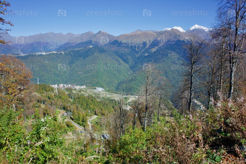 Вид на спортивный гостиничный комплекс Роза Плато на фоне Кавказских гор. Сочи Россия