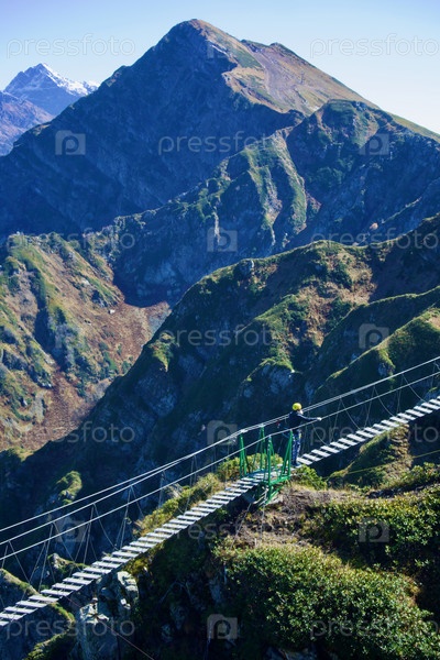 Туристы пересекают веревочный мост через пропасть на фоне Кавказских гор