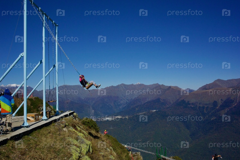 Девушка качается на качелях над пропастью на вершине горы Роза Пик