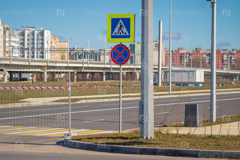 Открытое пространство с дорожными знаками и дорожной разметкой, дорожными перекрестками, пешеходными переходами, солнечным днем, голубым небом, фоном городского пейзажа