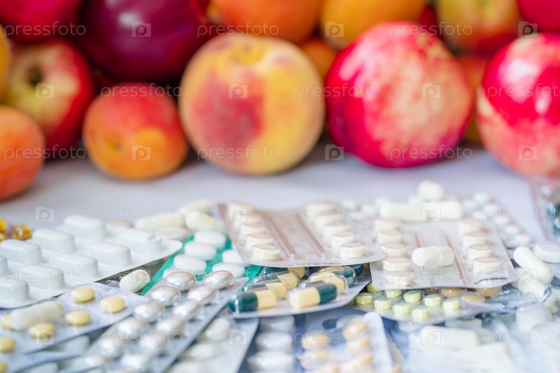 Куча таблеток, лежащих рядом с кучей фруктов, размытый фон