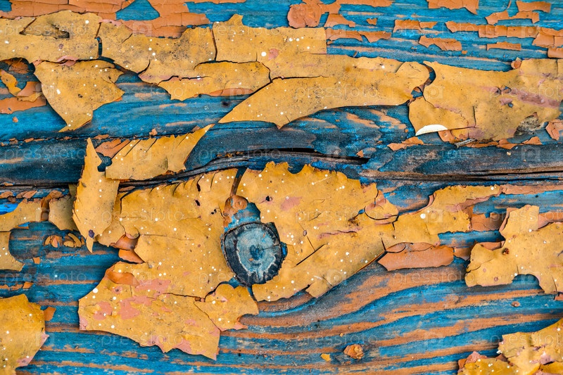 Старая облупившаяся желтая краска на синей деревянной доске, текстура