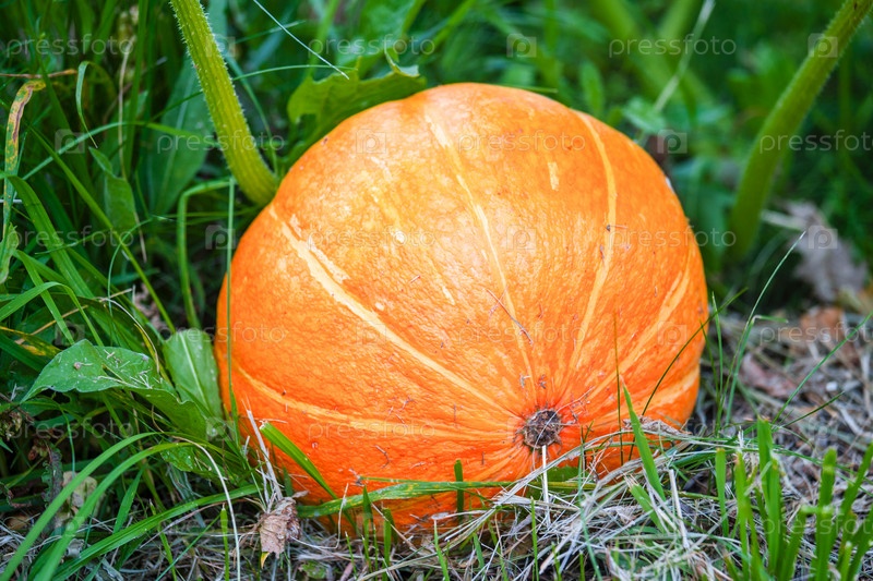 Яркая красивая оранжевая спелая тыква среди зелени