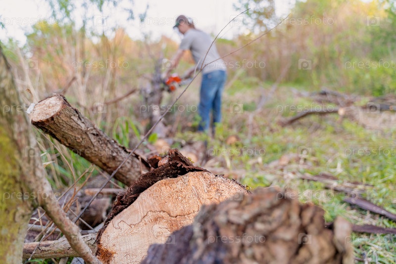 Фермер распиливает дерево бензопилой, избирательный фокус, фокус на переднем плане, размытый фон