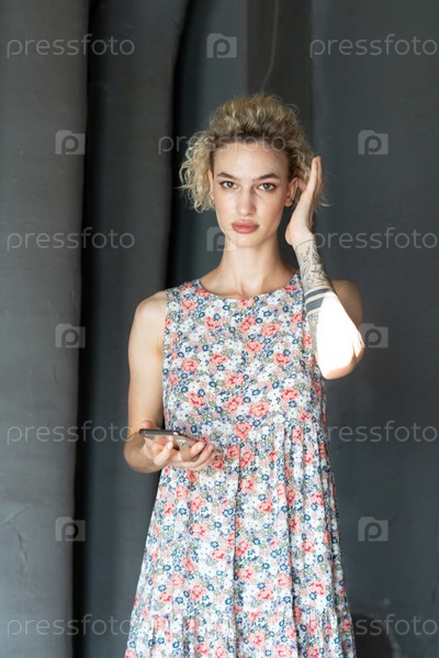 Молодая красивая женщина позирует в цветном платье в студии