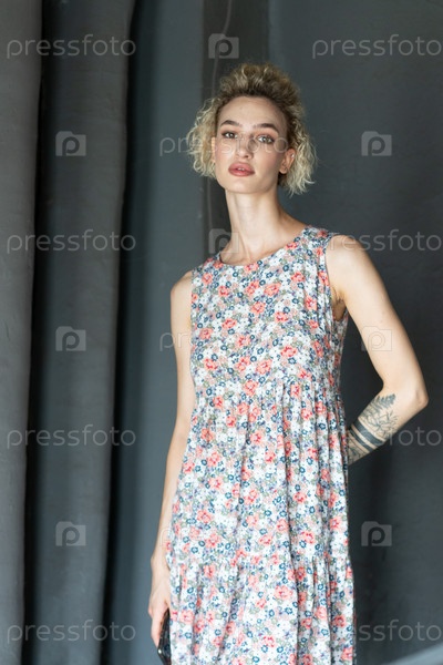 Молодая красивая женщина позирует в цветном платье в студии