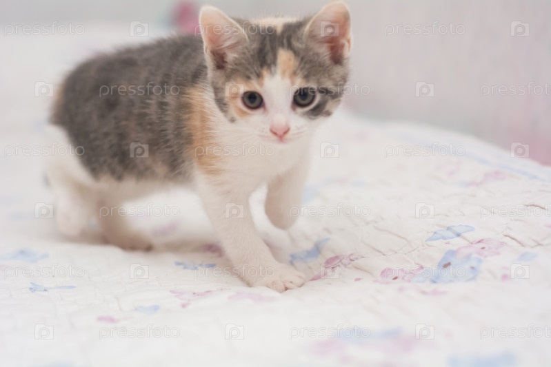 Котенок трехцветный месячный игриво позирует перед камерой