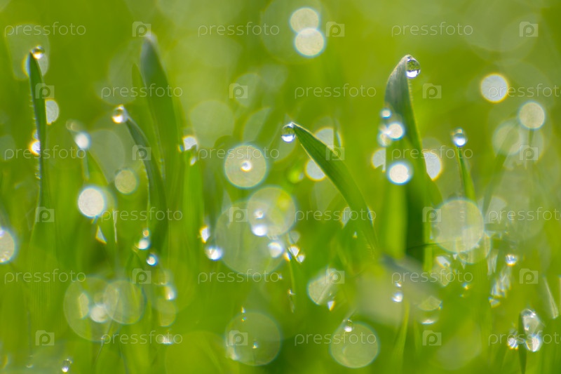 Утренняя роса на весенней зеленой траве, капельках воды