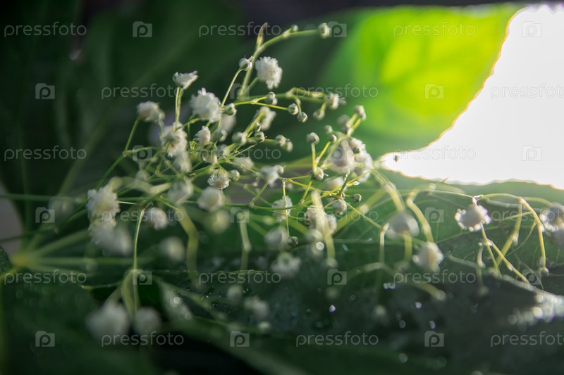 Цветочная композиция из гипсофиловых огней и листьев Аралии