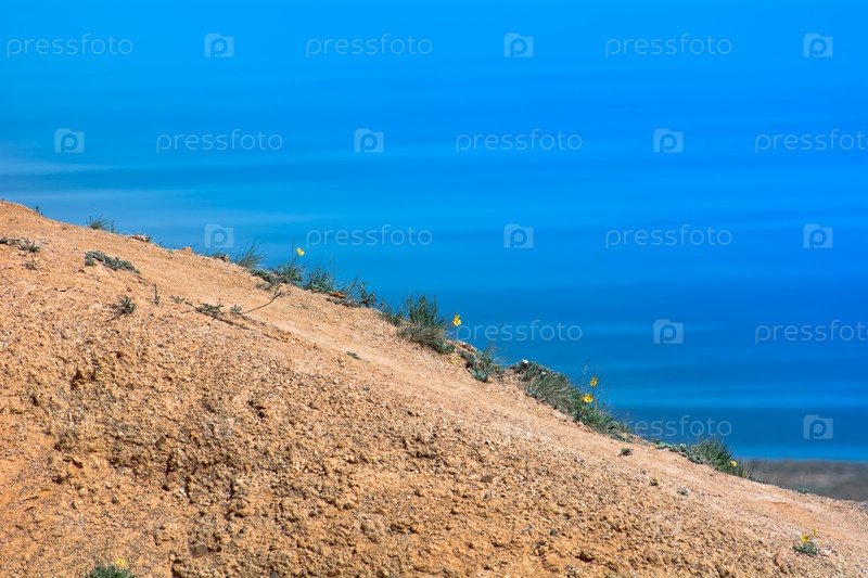 Желтый мак, растущий на песчаной почве, на фоне озера Иссык-Куль