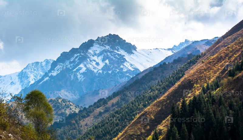 Горный лес и заснеженные горы в ущелье Чичкан Кыргызстан