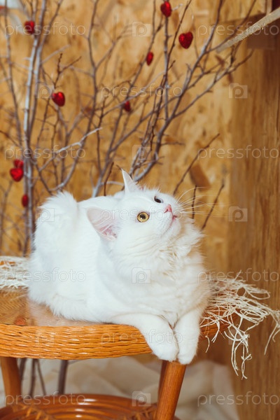 Белый пушистый ангорский кот с разноцветными глазами лежит на столе и смотрит вверх