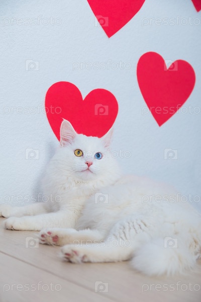 Белый пушистый ангорский кот с разноцветными глазами впечатляюще лежит на фоне сердечек