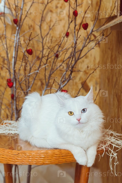 Белый пушистый ангорский кот с разноцветными глазами лежит на столе на фоне дерева, украшенного сердечками