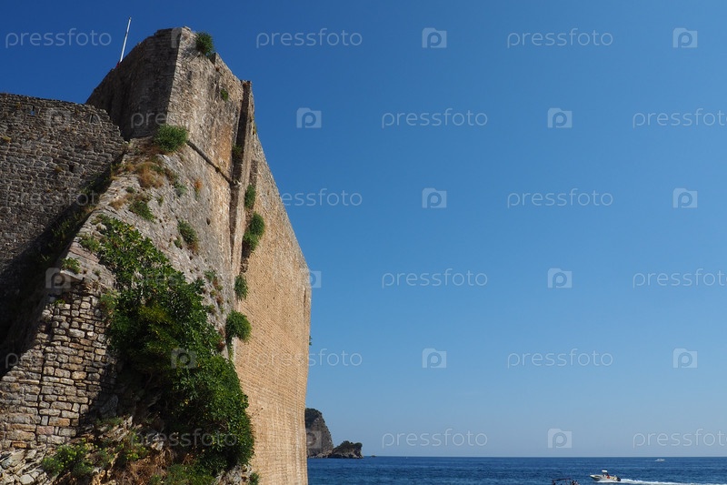 Цитадель Будва, Старый город в солнечный день, Черногория. Каменные стены. Голубое небо. Укрепления Будвы представляют собой типичные для средневековых городов Адриатики башни, амбразуры, укрепленные городские ворота и цитадель
