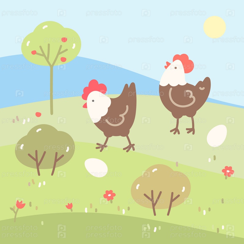 Векторный пейзаж кур-несушек и яиц