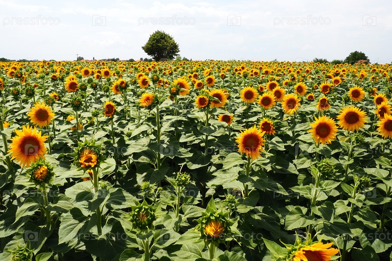 Поле сельскохозяйственных подсолнечников. Подсолнечник Helianthus род растений семейства Астровые. Однолетний и клубневый подсолнечник. Цветящий бутон с желтыми листьями. Сербия, Сремска-Митровица