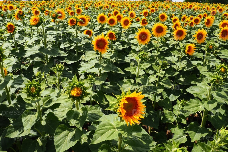 Поле сельскохозяйственных подсолнечников. Подсолнечник Helianthus род растений семейства Астровые. Однолетний и клубневый подсолнечник. Цветящий бутон с желтыми листьями. Сербия, Сремска-Митровица