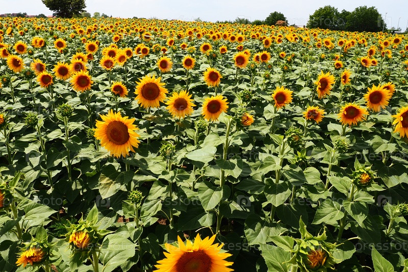 Поле сельскохозяйственных подсолнечников. Подсолнечник Helianthus род растений семейства Астровые. Однолетний и клубневый подсолнечник. Цветящий бутон с желтыми листьями. Сербия, Сремска Митровица