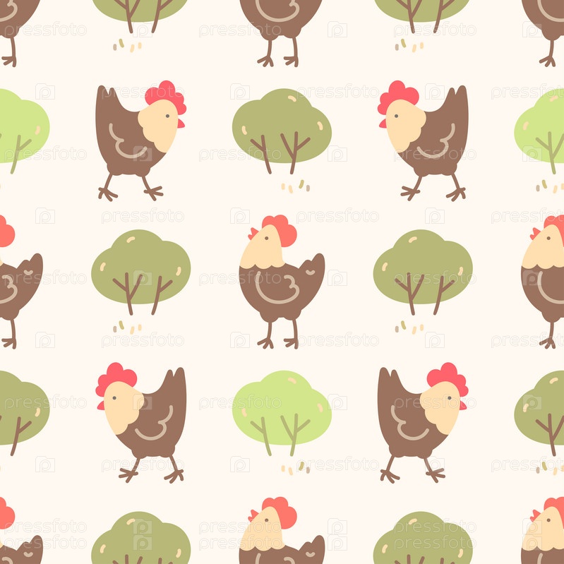 Бесшовный рисунок с курами-несушками и яйцами. Ферма
