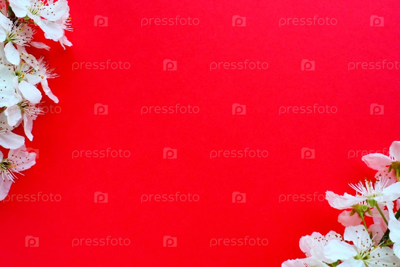 Белые цветки черемухи на красном фоне. Скопируйте место для текста. Яркая открытка к празднику или приглашению. Весеннее время