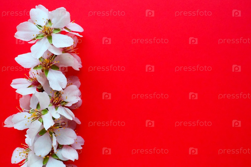 Белые цветки черемухи на красном фоне. Скопируйте место для текста. Яркая открытка к празднику или приглашению. Весеннее время