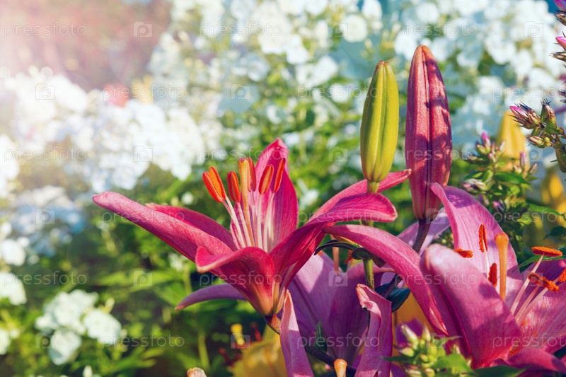 Красноцветущие лилии и нераспустившиеся бутоны
