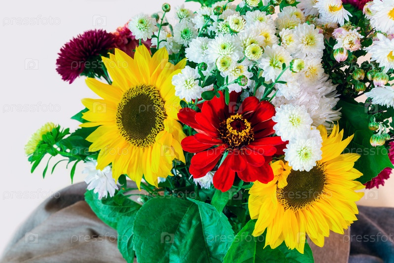 Букет цветов подсолнуха, хризантем и циннии