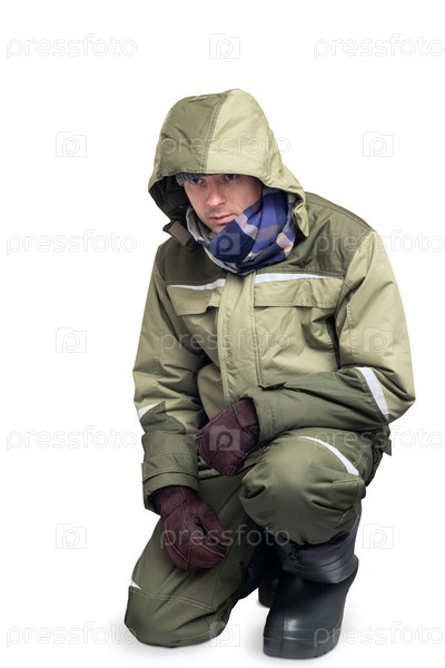 Мужчина в теплой зимней одежде для морозной и холодной погоды. Приседание