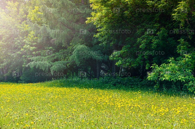 Поле желтых одуванчиков среди зеленых деревьев