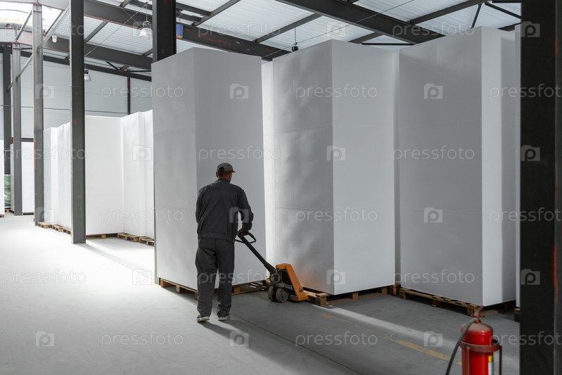 Большие блоки пенополистирола сложены на складе