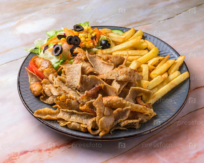 Куриная шаурма с салатом, картофелем фри, подаваемым в блюде, изолированном на сером фоне, вид сбоку на арабский фастфуд,